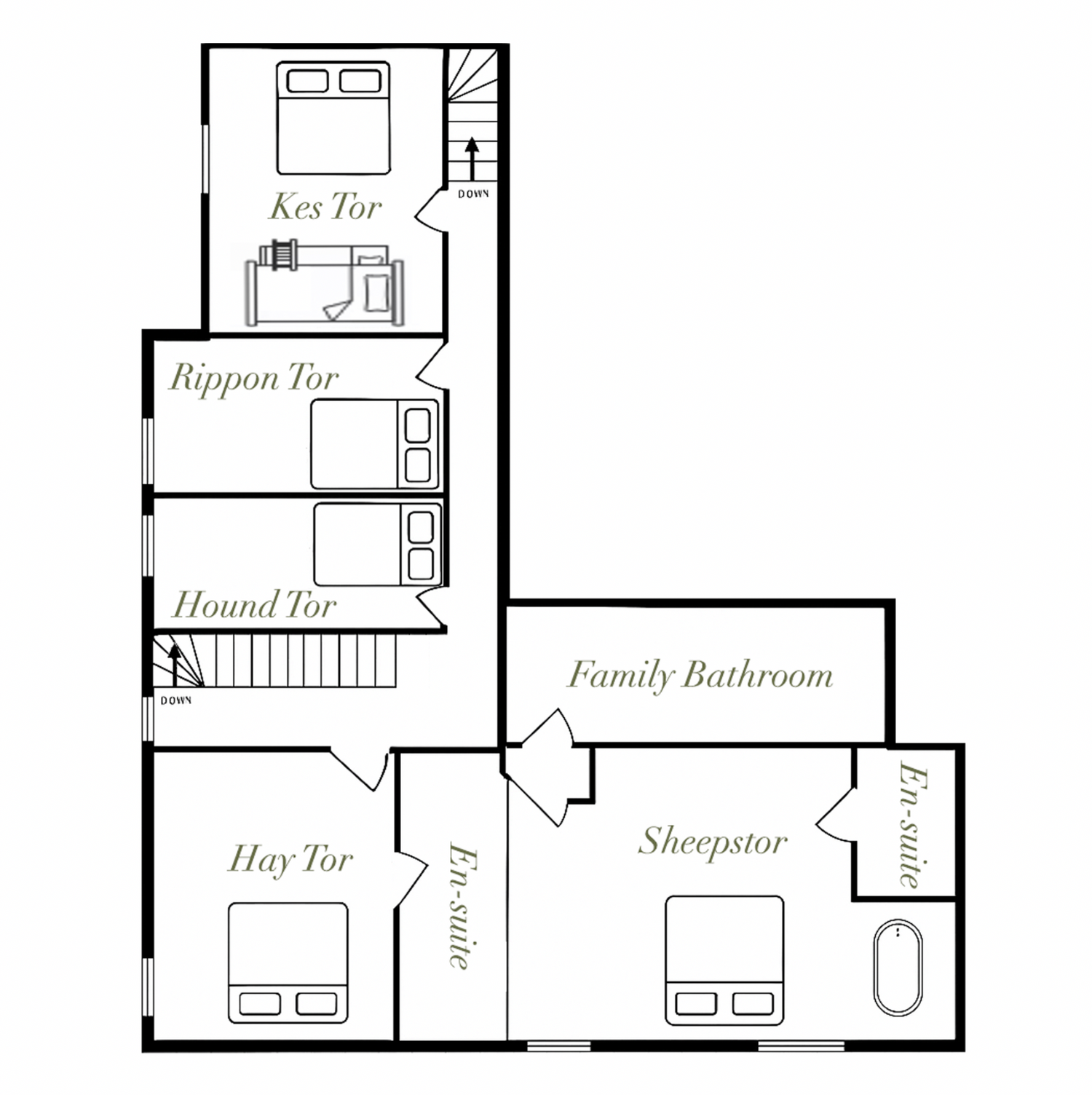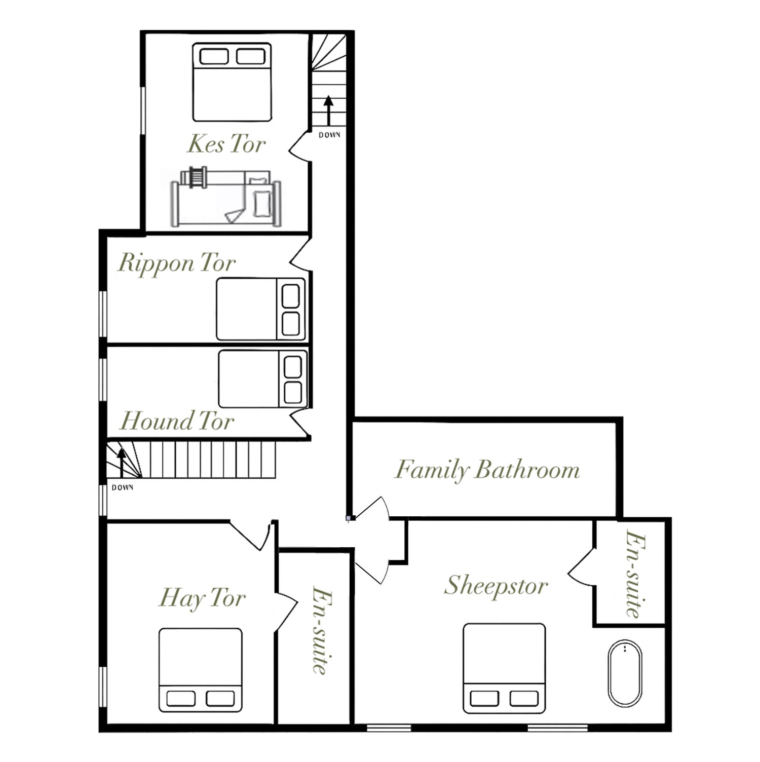 The central rooms Hound Tor & Rippon Tor, offer double beds, with Kes Tor at the end having a double and also providing a bunk bed too!